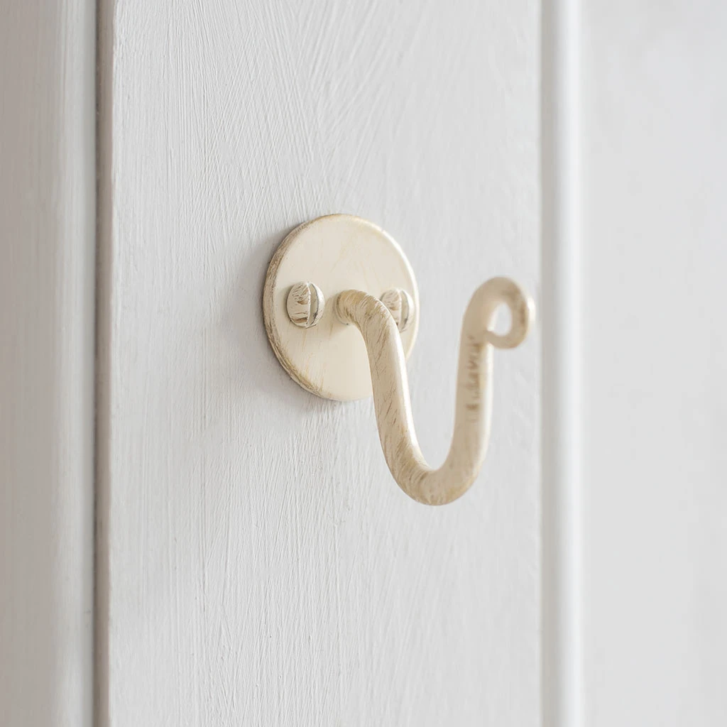 This Hatton hook is finished in old ivory which is created when the metal is overlaid with gold paint and an ivory top coat that is carefully distressed to reveal the gold underneath. This gives it a soft, distressed look that will be at home in any traditional or contemporary setting.
