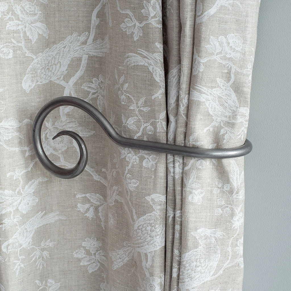 A hand forged, solid steel holdback to match our Bishop’s Crook finial. The holdbacks are available in two sizes: this larger holdback is generally recommended where there is more than one width of fabric in the curtain, unless it is a very light, unlined fabric.