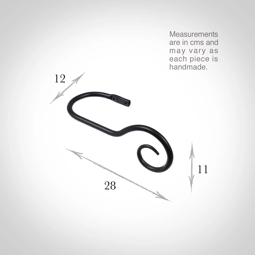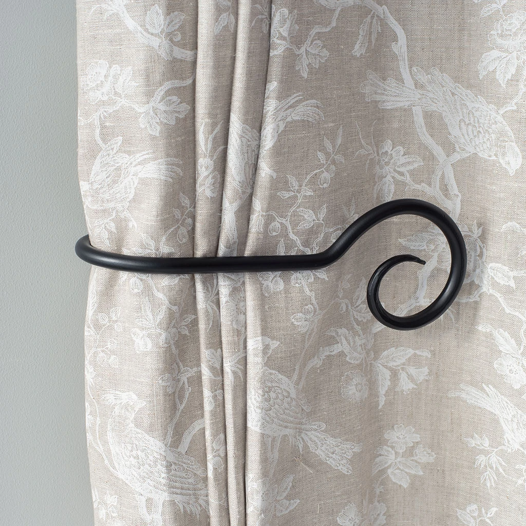 This monkey tail style holdback is hand forged and available in a choice of finishes to match your pole. We make the holdback in two sizes: unless your curtain is very light or has no more than a width of fabric we generally recommend this larger size.