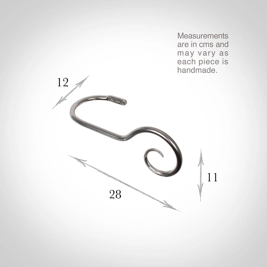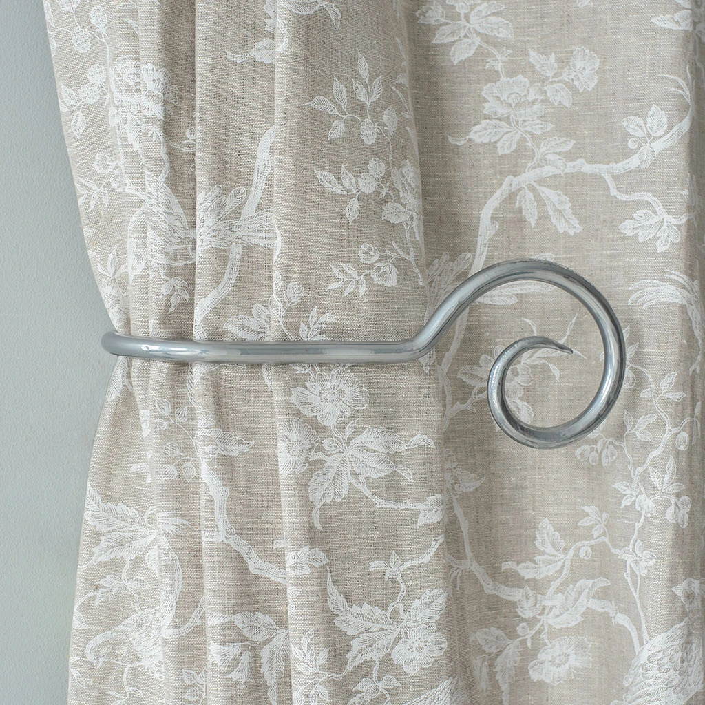 This monkey tail style holdback is hand forged and available in a choice of finishes to match your pole. We make the holdback in two sizes: unless your curtain is very light or has no more than a width of fabric we generally recommend this larger size.