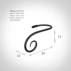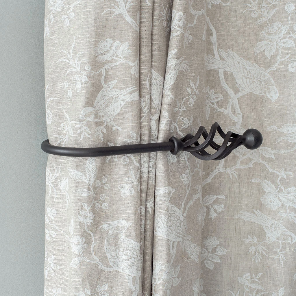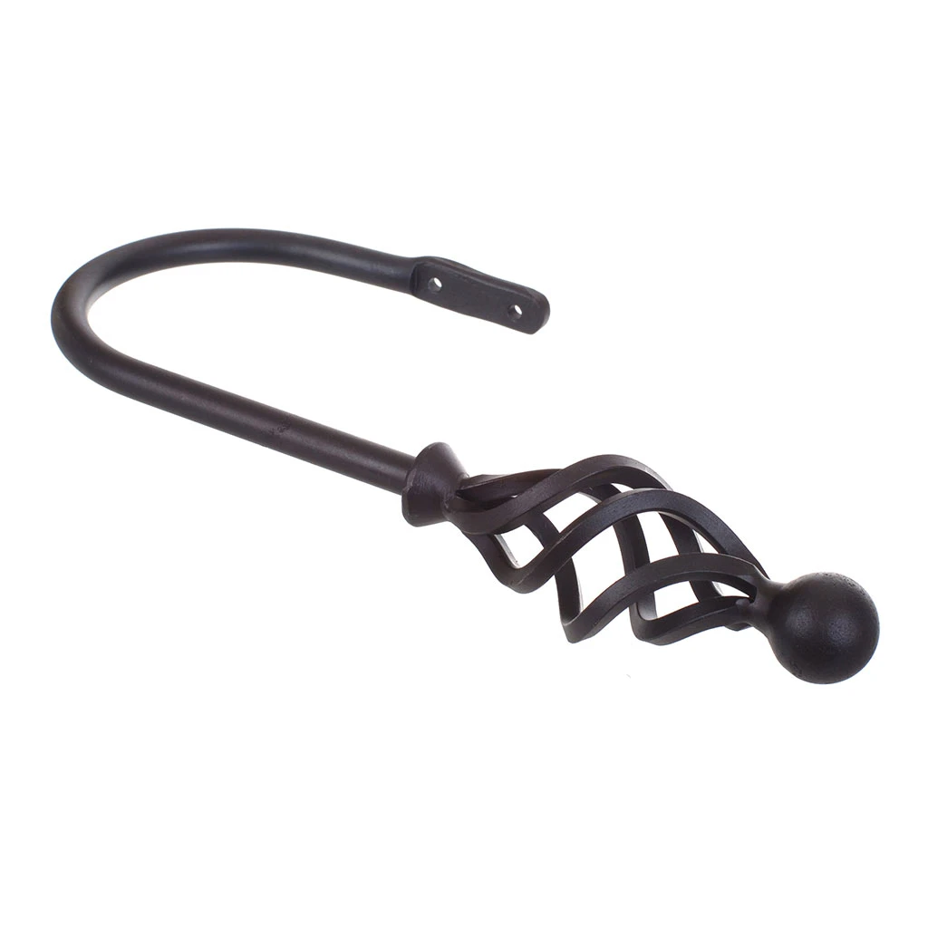 A hand forged, solid steel holdback to match our Cage & Ball finial. The holdbacks are available in two sizes: this larger size is generally recommended where there is more than one width of fabric in the curtain (unless it is a very light, unlined fabric).