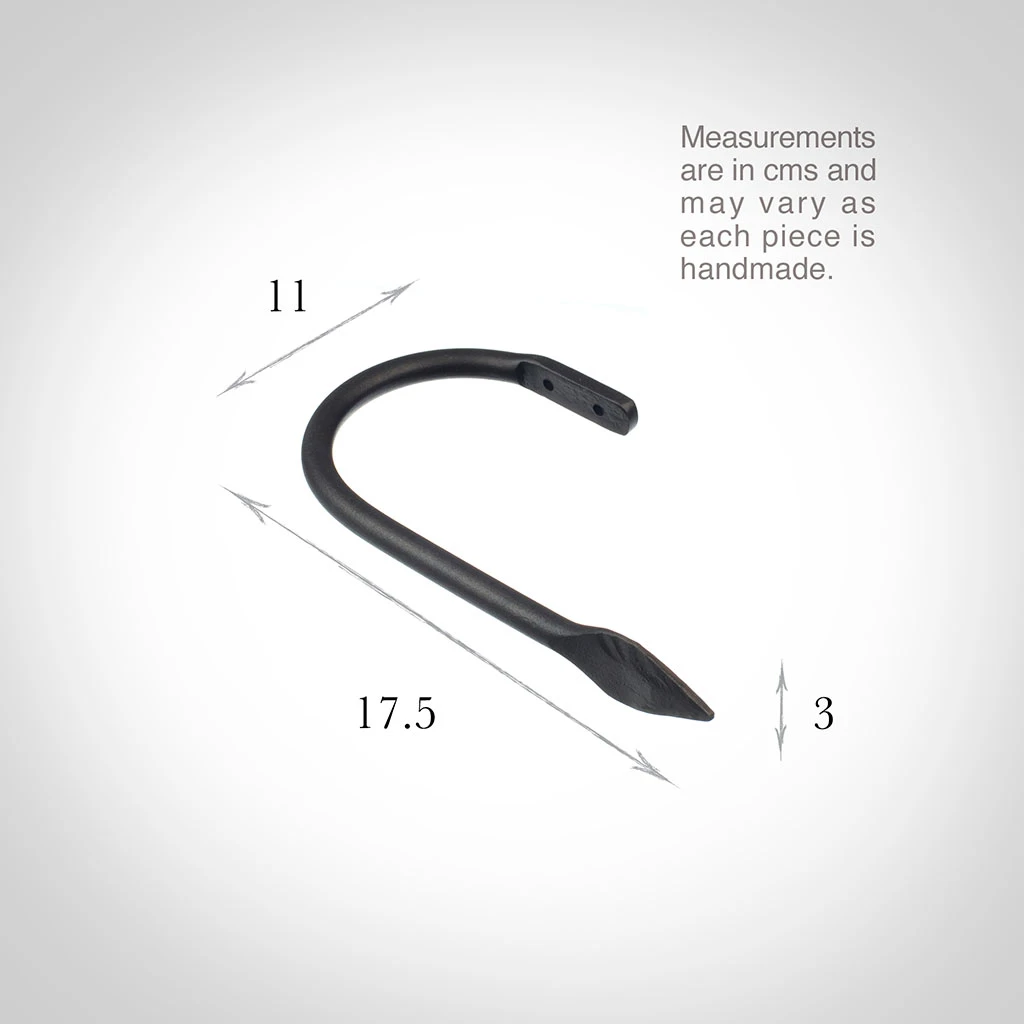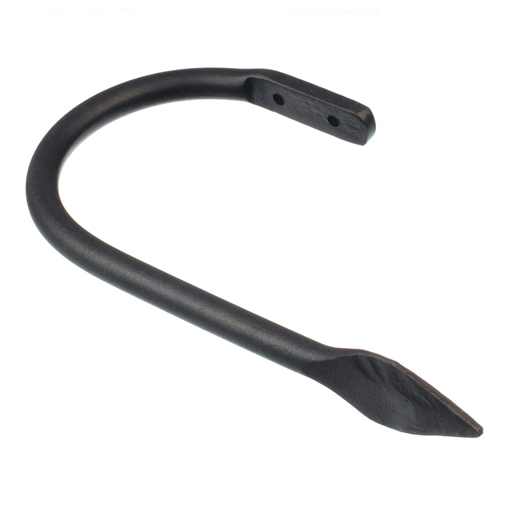 A hand forged, solid steel holdback to match our Spear finial. The holdbacks are available in two sizes: this larger holdback is generally recommended where there is more than one width of fabric in the curtain, unless it is a very light, unlined fabric.