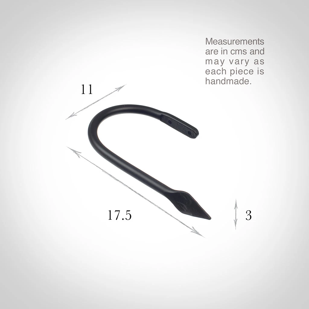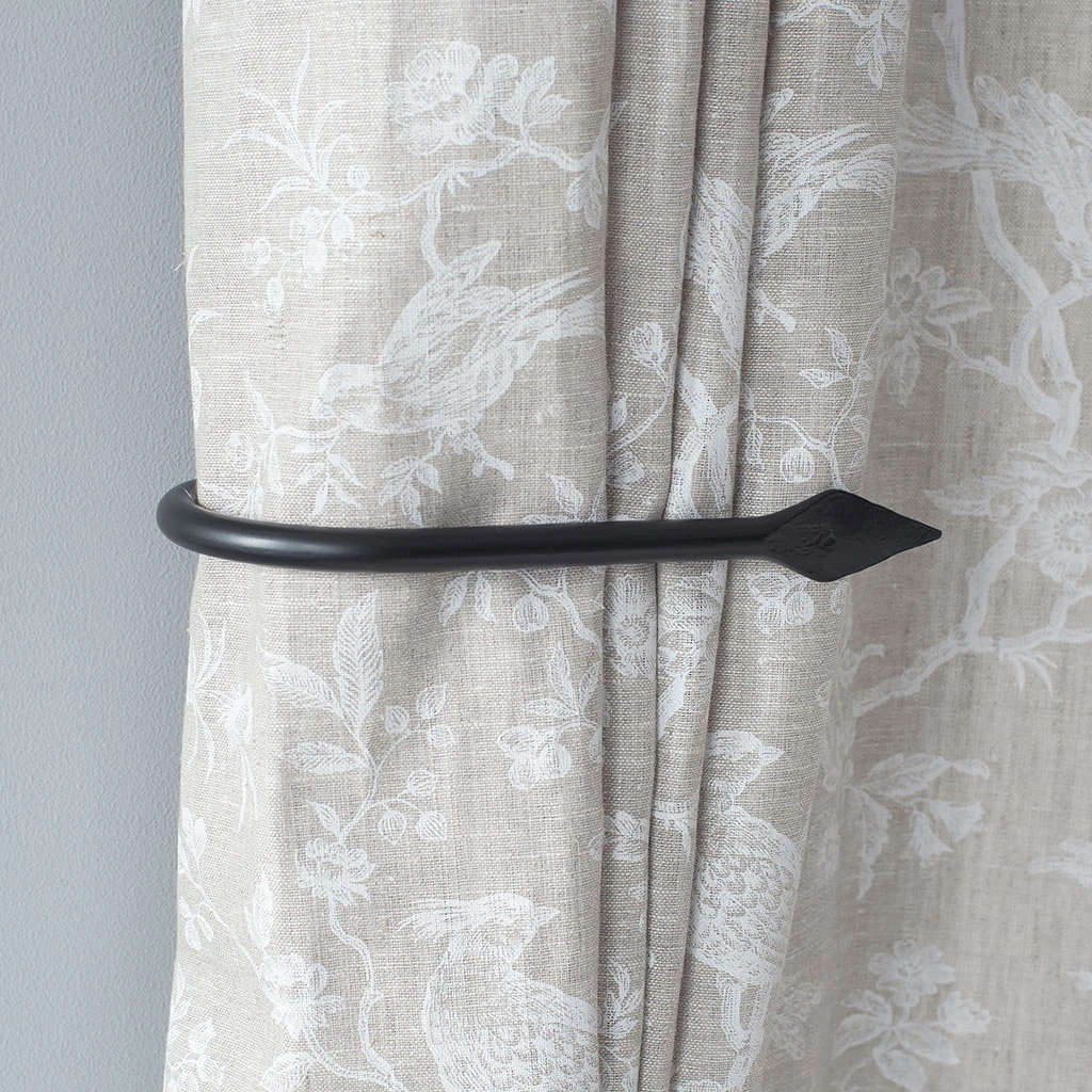 A hand forged, solid steel holdback to match our Spear finial. The holdbacks are available in two sizes: this larger holdback is generally recommended where there is more than one width of fabric in the curtain, unless it is a very light, unlined fabric.