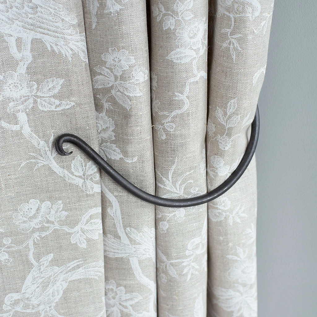 A hand forged holdback which hangs flat against the wall when not in use. The Swing Holdback is available in two sizes (large and small) and a choice of finishes.