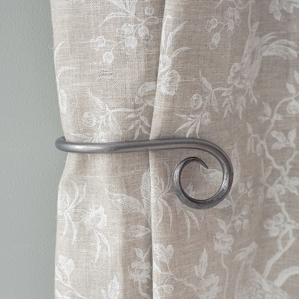 A hand forged, solid steel holdback to match our Crook finial. The holdbacks are available in two sizes: this smaller holdback is generally recommended where there is only one width of fabric in the curtain (or more if it is a very light, unlined fabric).