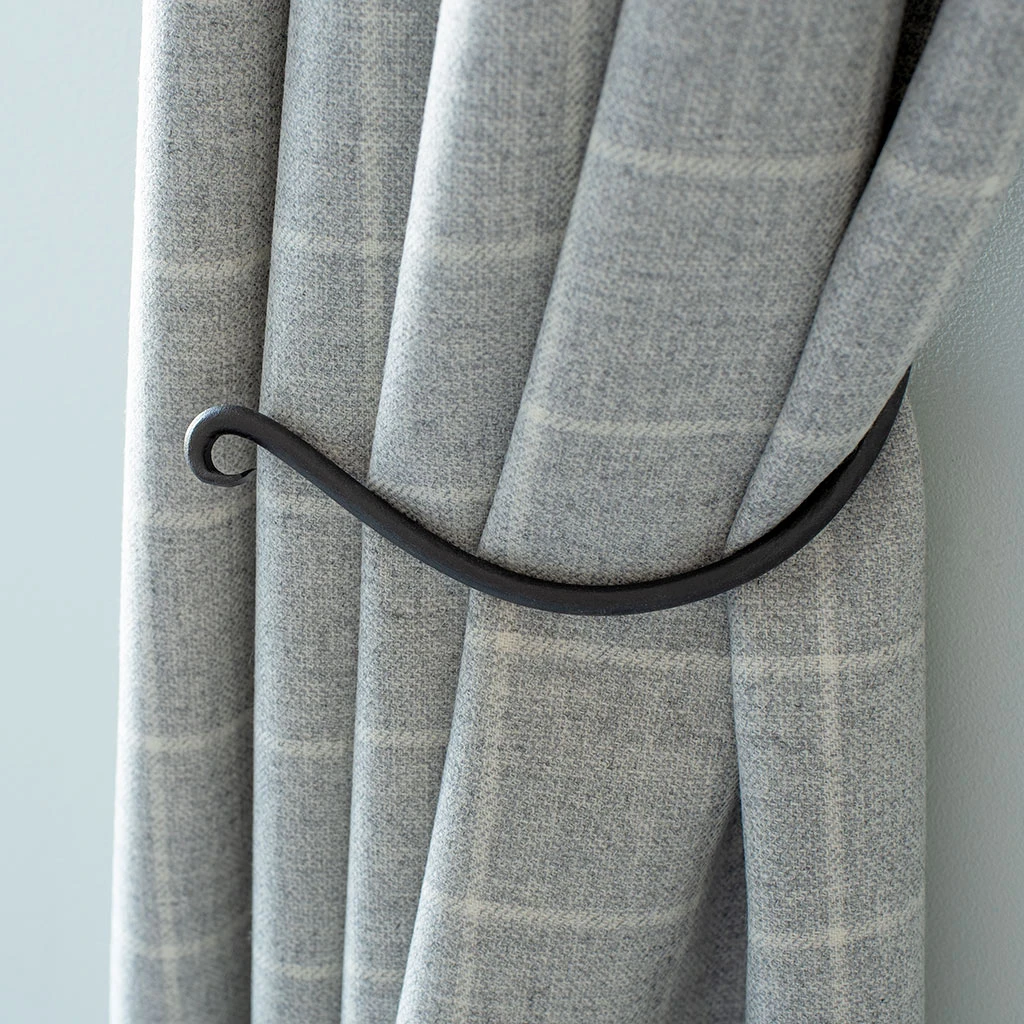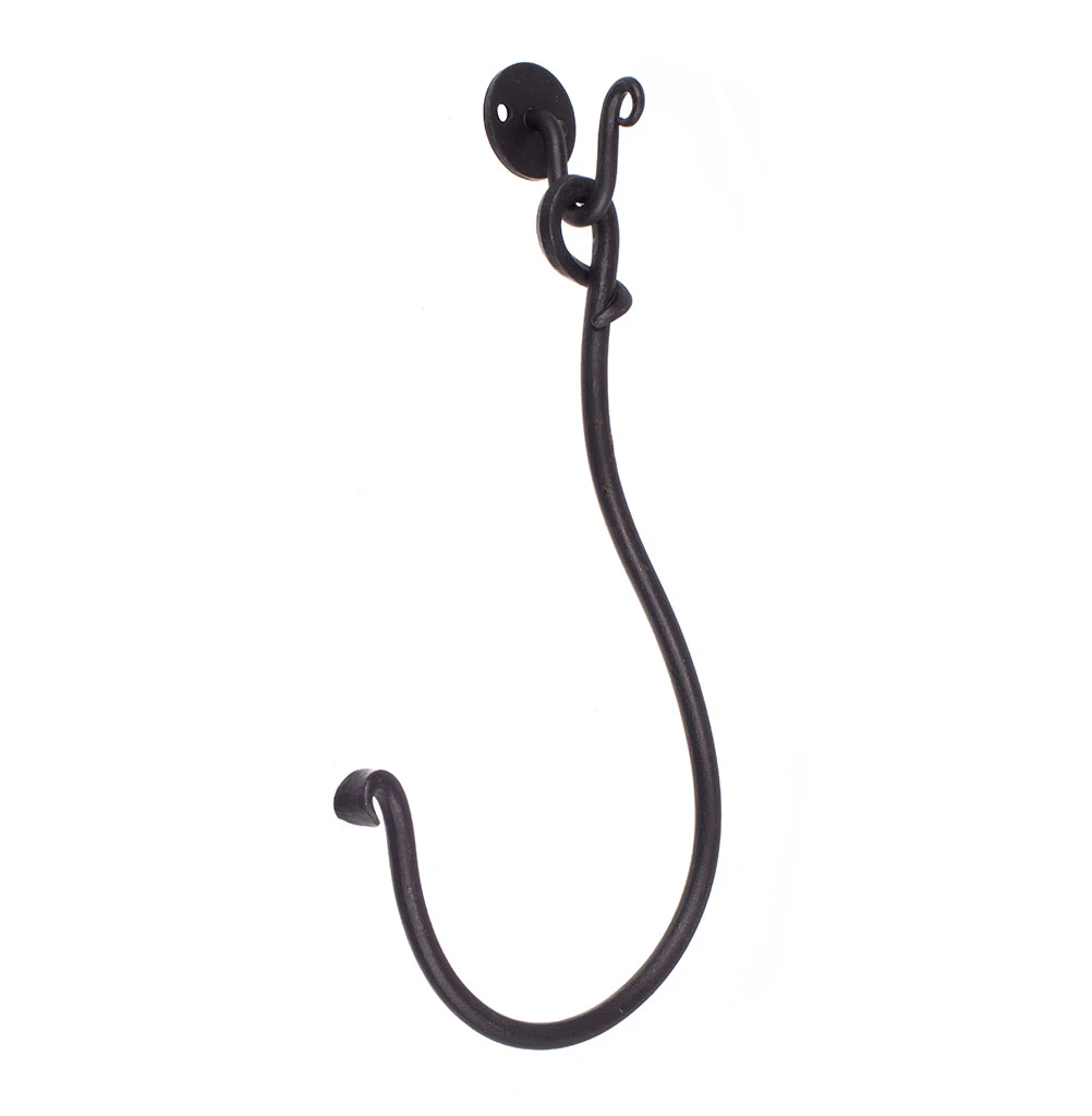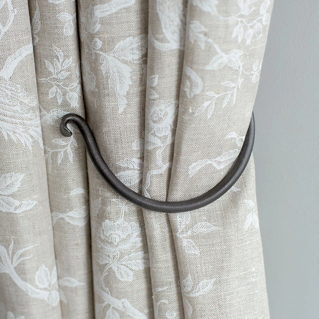 A hand forged holdback which hangs flat against the wall when not in use. The Swing Holdback is available in two sizes and a choice of finishes.